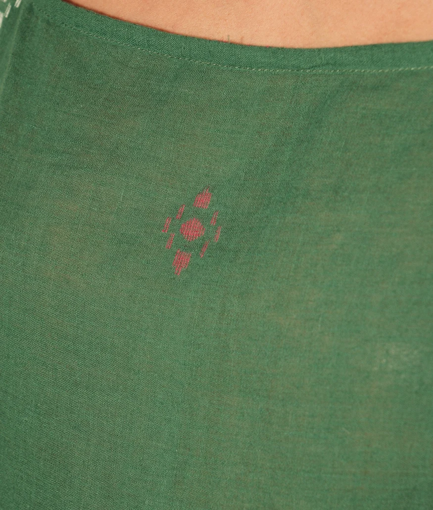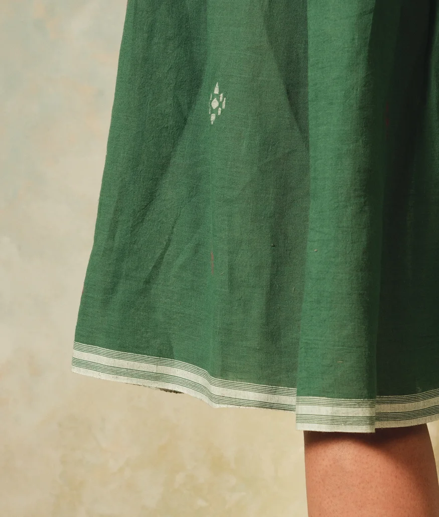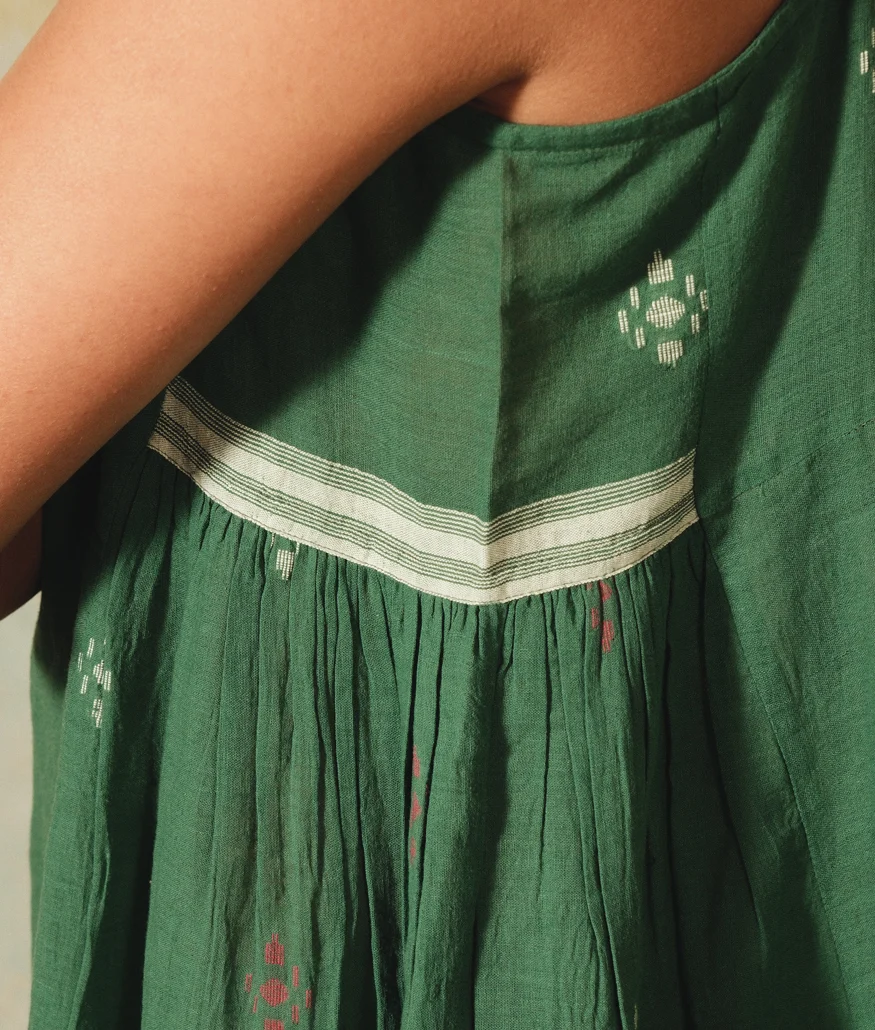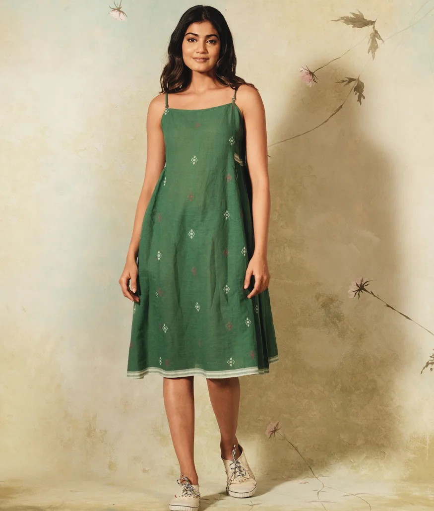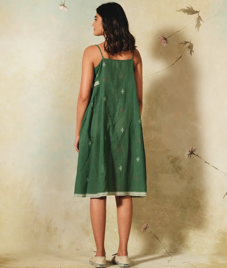 An airy, flowy silhouette crafted in handwoven silk and printed with delicate floral motifs that whisper of quiet gardens. This slip dress in rich emerald green features a softly flared shape that moves effortlessly with you. The selvedge detailing at the hem and along the yoke adds a subtle contrast, while adjustable shoulder straps ensure a comfortable fit.