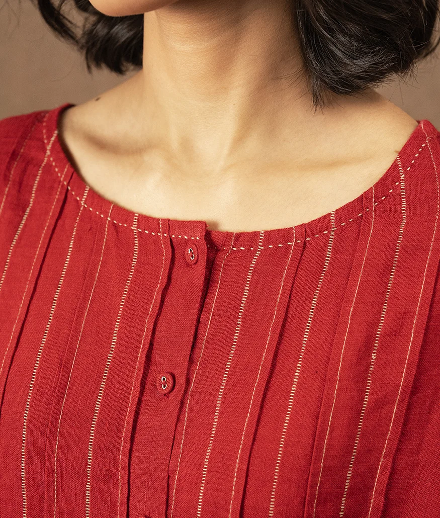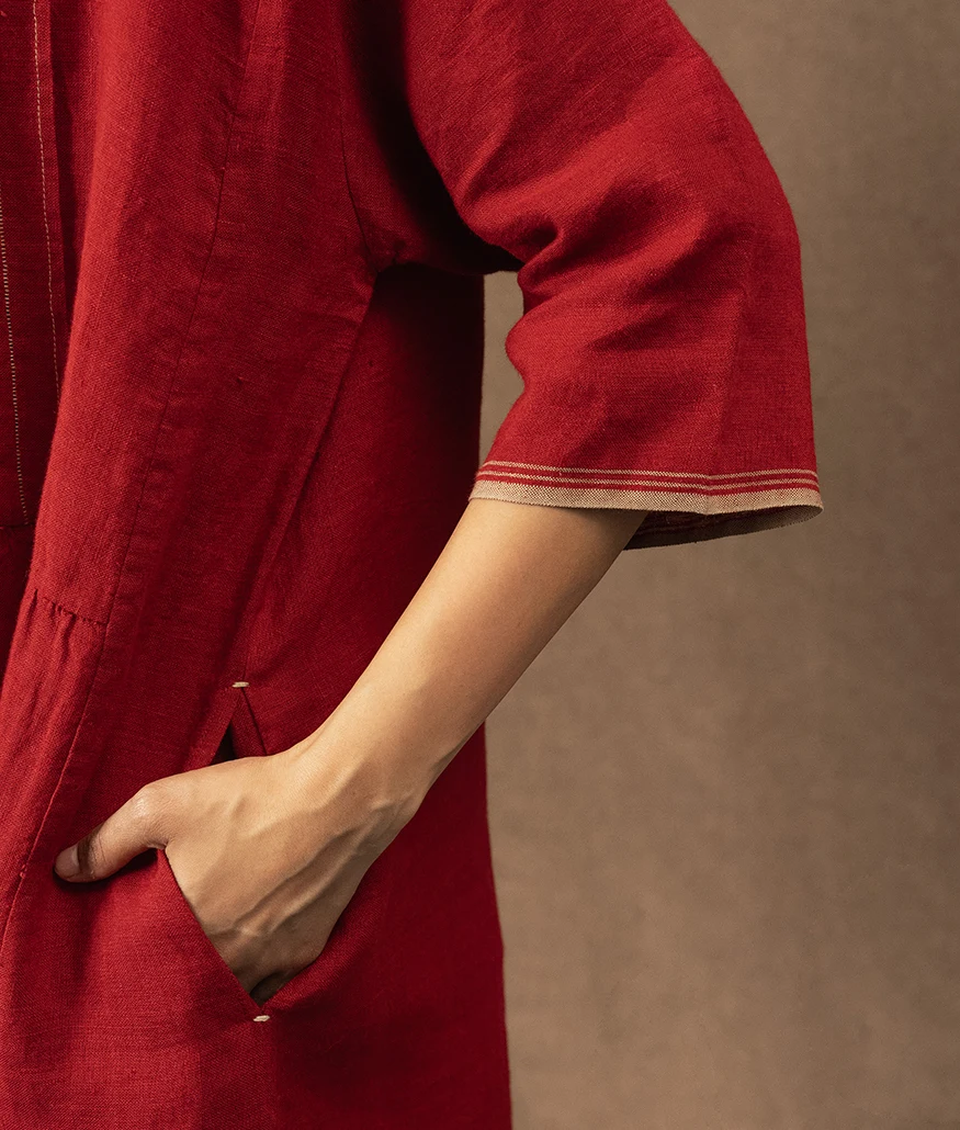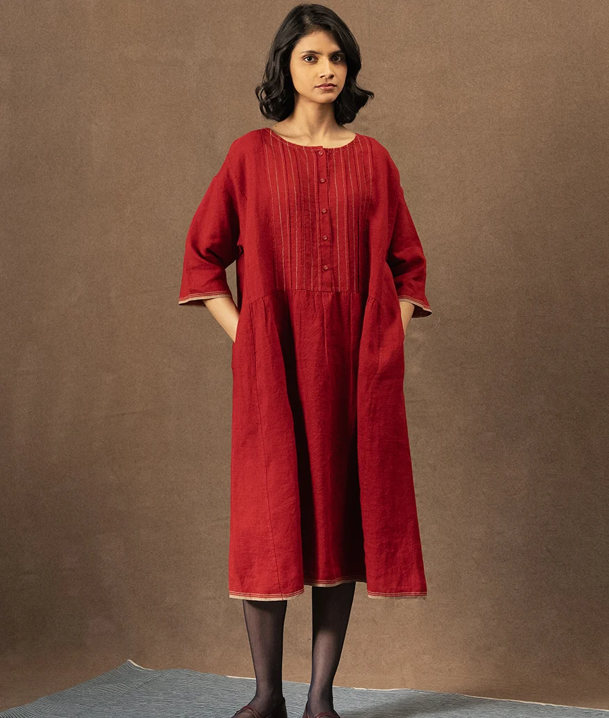 Crafted from soft handwoven linen, this crimson dress features delicate pintucks along the front yoke and a gentle gather at the waist. Finished with a row of fabric buttons and subtle contrast stitching at the hem and sleeves, it’s a relaxed silhouette designed for everyday ease. Effortless, breathable, and timeless.