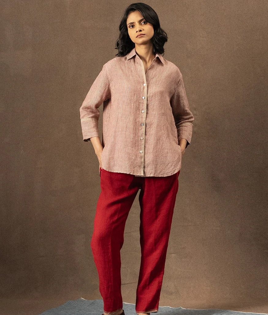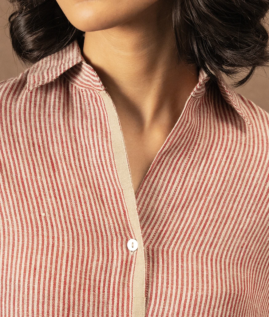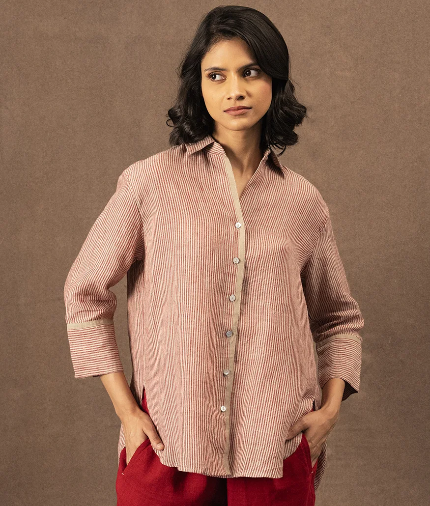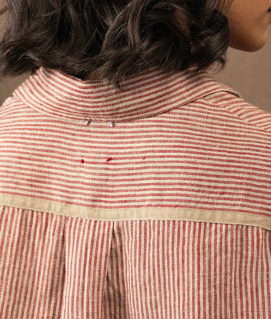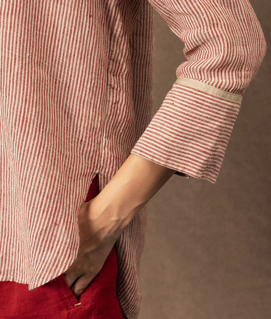 Handwoven Linen Striped Shirt is a  relaxed button-down shirt, featuring fine red and natural stripes. The shirt has a slightly oversized silhouette with dropped shoulders and a gentle flare, making it both airy and flattering. Thoughtful details include a neat collar, a full button placket with contrast selvedge trim, and wide cuffs for an easy fold-back finish. The back is softly pleated for movement, enhancing comfort and flow.