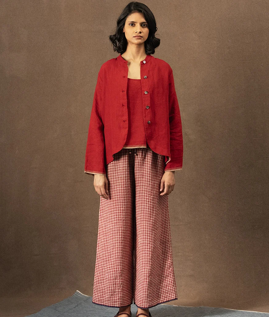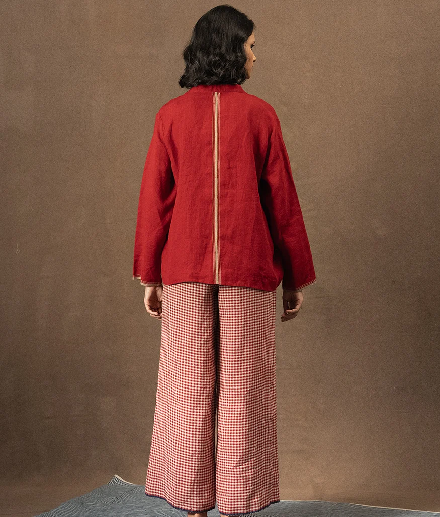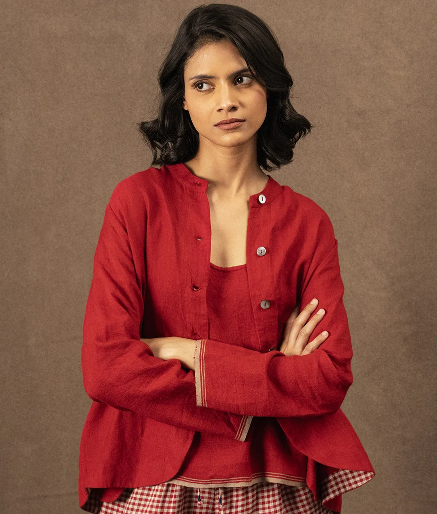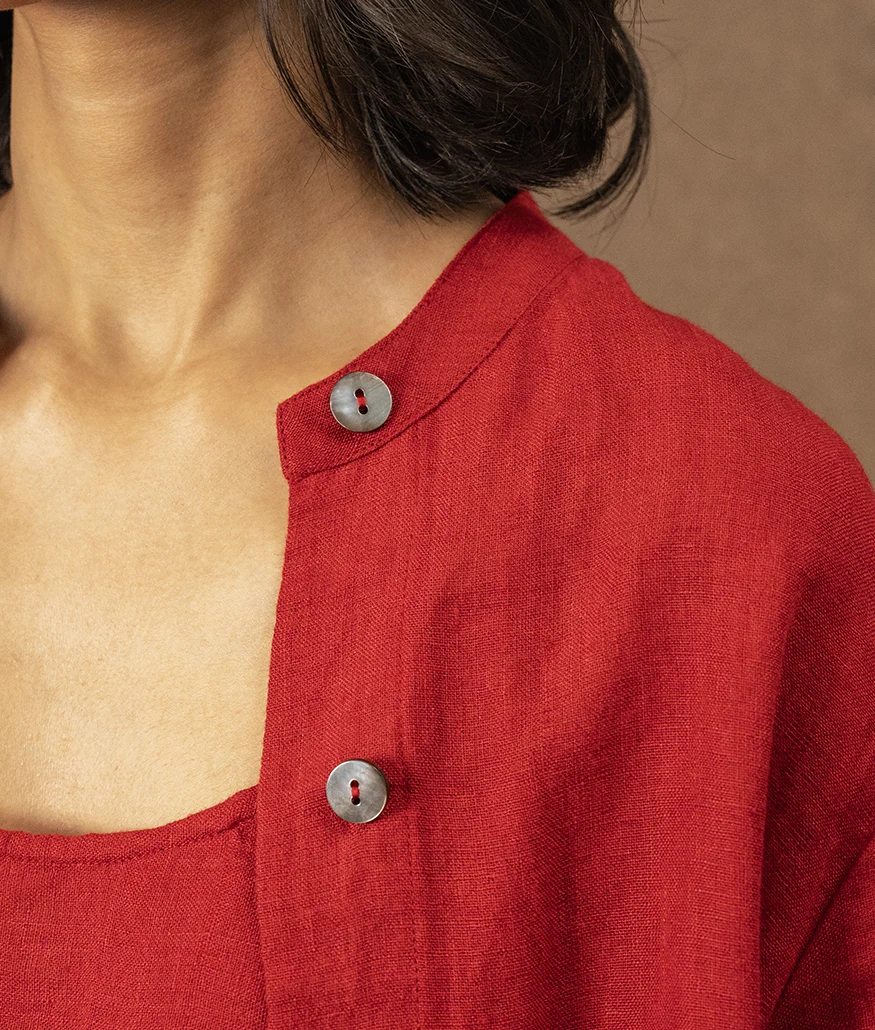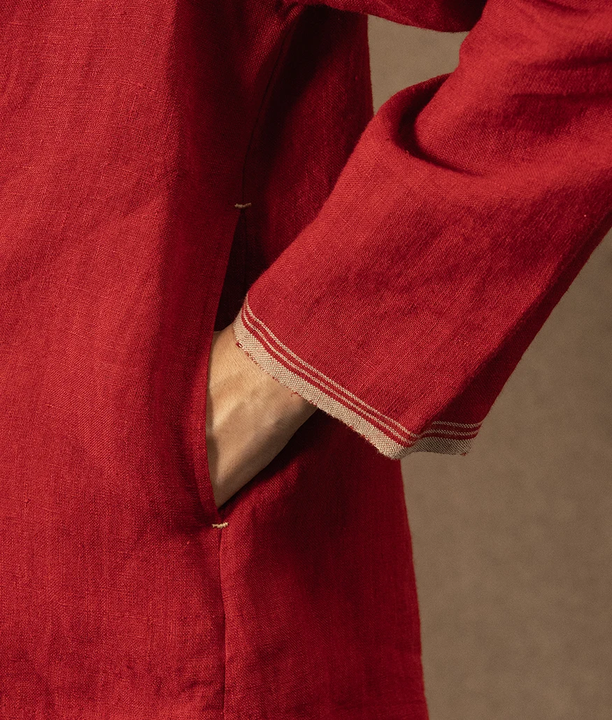 Handwoven Red Linen Jacket in a deep red tone, crafted in a relaxed, easy silhouette. It features a clean collarless neckline with button closure, selvedge detailing at the placket and cuffs, and practical side pockets. The back is highlighted with a vertical woven selvedge stripe, adding a subtle artisanal accent.